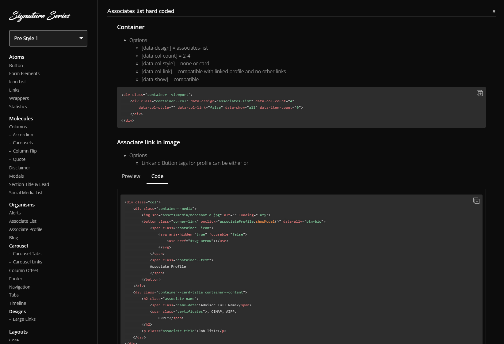 With a competent based system, it's easy to move items and sections around to build the site of our advisors needs. Documentation with previews and code snippets ready to copy and paste streamlined building for the team.